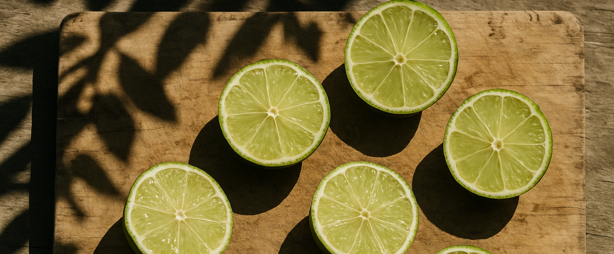 KI generiert: Vier Limettenhälften und ein Messer auf einem Holzbrett.