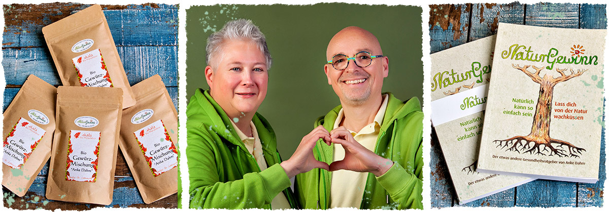 Die beiden Wahl-Ostfriesen geben viele Seminare zu verschiedenen Themen rund um eine gesunde naturnahe Ernährung. Neben den spannenden Inhalten, die sie vermitteln, vertreiben sie auch eine wunderbar abgestimmte Bio-Gewürzmischung aus den „8 Helferlein der Natur“, die vor langer Zeit mit Dr. Shamira, einer indischen Naturmedizinerin, zusammen erarbeitet worden ist. Mit ihrem amüsanten Ratgeber „NaturGewinn“ nehmen Anke und Frank euch mit auf eine spannende Körperreise.