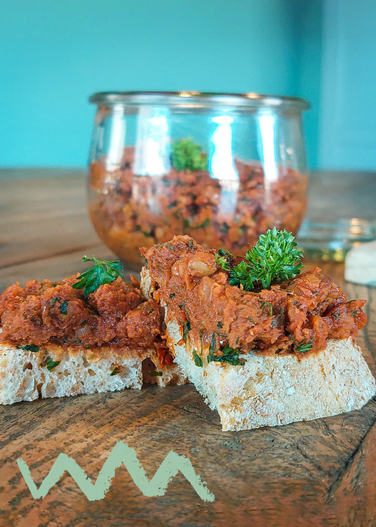 Öl in einem Topf erhitzen. Zwiebeln und Knoblauch darin ca. 4 Minuten bei mittlerer Hitze anschwitzen. Tomatenmark zugeben und ca. 1-2 Minuten mit anbraten. ¼ TL Salz, Pfeffer und Thymian unterrühren. Linsen untermischen und mit einem Kartoffelstampfer leicht zerdrücken, sodass ein sämiger Aufstrich entsteht, jedoch ein paar Linsen sichtbar bleiben.