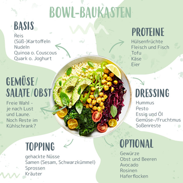 Bunte Bowls sind der Hit! Sie sind dein persönliches Kunstwerk aus Gemüse, Körnern und allem, was dir schmeckt. Mit einer Schüssel voller Farben und Vitalstoffen startest du voller Energie durch – und das Beste? Du kannst nach Herzenslust variieren. Vorbereitet eignen sie sich auch super als als gesundes Mittagessen bei der Arbeit. Hierzu kannst du deine Zutaten in eine Lunchbox oder in einem To-Go Glas vorbereiten. Dressing und Toppings in einem kleinen extra Behältnis mitnehmen und in deiner Pause drüber geben. Fertig.