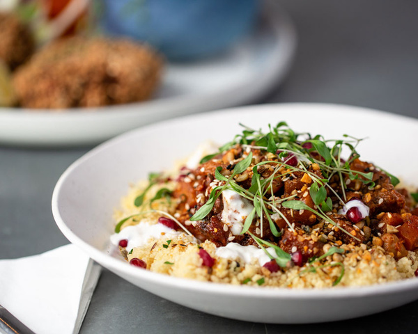 Orientalische Bowl: Couscous, saftig gebratenes Rinderhack , gewürzt mit Kreuzkümmel und Koriander, Auberginen, Datteln, Minzjoghurt, geröstete Kichererbsen und ein Hauch von Harissa.