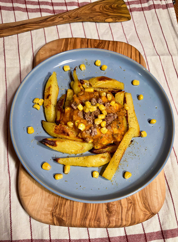 Abschließend die Kartoffeln aus dem Ofen nehmen und auf einen Teller platzieren, die Sauce gut darauf verteilen und abschließend noch mit etwas Basilikum würzen :)