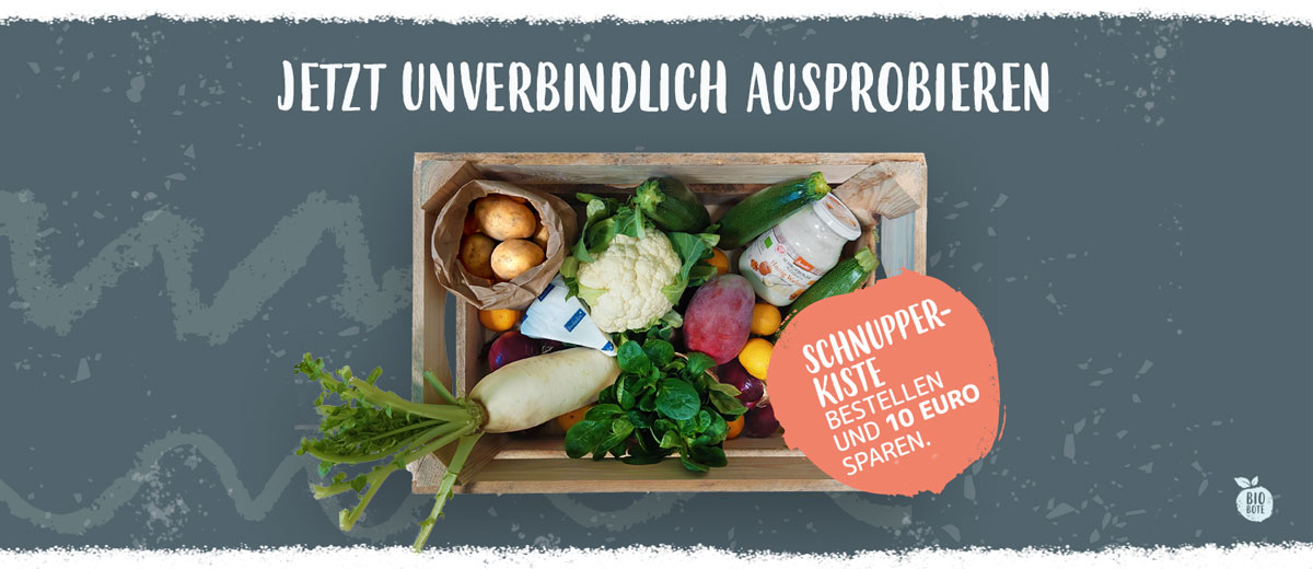 Für alle, die sich erstmal selbst von unserer Biokiste und dem bequemen Lieferservice überzeugen wollen, gibt es unser Kennenlernangebot. Die Schnupperkiste. Mit dieser Bio-Probekiste erlebst du viermal ganz unverbindlich den Unterschied von knackfrischem Obst und Gemüse im Vergleich zu Supermarktware.