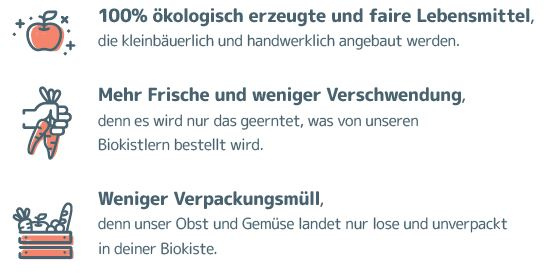 Dann teste uns doch einfach ganz unverbindlich und probiere unsere Schnupperkiste. Das ist unser Kennenlernangebot für dich. Freue dich über 100% Bio-Qualität in deiner Kiste, die dir ganz easy und unkompliziert viermal nach Hause geliefert wird. Erst danach entscheidest du, ob sie etwas für dich ist.