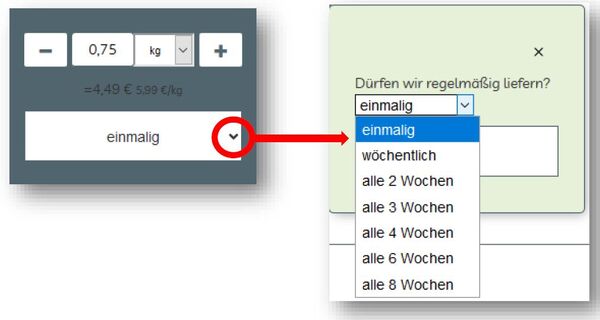 Du kannst bei jedem Artikel oder jeder Biokiste individuell wählen, ob du diese einmalig (für den ausgewählten Liefertag) oder für den von dir gewählten Lieferrhythmus erhalten möchtest. Hast du deine Bestellung abgeschickt, siehst du deine hinterlegten Abos im Profilbereich unter „Mein Abo“.