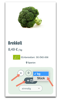 Um einen gewünschten Artikel in den Warenkorb zu legen, kannst du bei vielen Artikeln wählen, ob du in kg oder Stück bestellen möchtest. Über das Plus-Symbol kannst du die Menge erhöhen. Mit dem Minus-Symbol reduzierst du die Menge. Oder du gibst die gewünschte Menge in kg oder Stück einfach in das Mengenfeld ein. Sobald sich das Feld dunkel färbt, ist die gewünschte Menge im Warenkorb. Es gibt also keinen Button „in den Warenkorb legen. Möchtest du den Artikel wieder aus dem Warenkorb entfernen, klicke auf das Minus-Symbol oder überschreibe das Zahlenfeld mit der Zahl Null. Ist das Feld wieder hell gefärbt, befindet sich der Artikel nicht mehr im Warenkorb. Alternativ kann man über den Warenkorb ebenfalls Änderungen vornehmen.