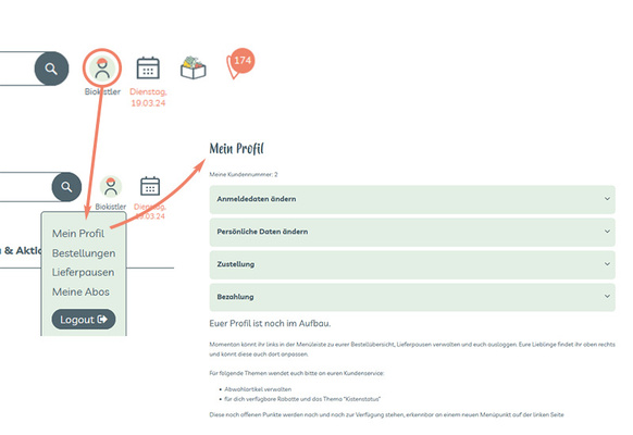 Nach der Anmeldung gelangst du über die Profilfigur zu deinem Kundenkonto mit verschiedenen Funktionen, wie Deinem Abo, der Möglichkeit Lieferpausen einzutragen, Deine favorisierten Artikel in einer Merkliste zu verwalten, Artikel die du nicht magst in einer Abwahlliste zu definieren oder deine letzen Bestellungen einzusehen.