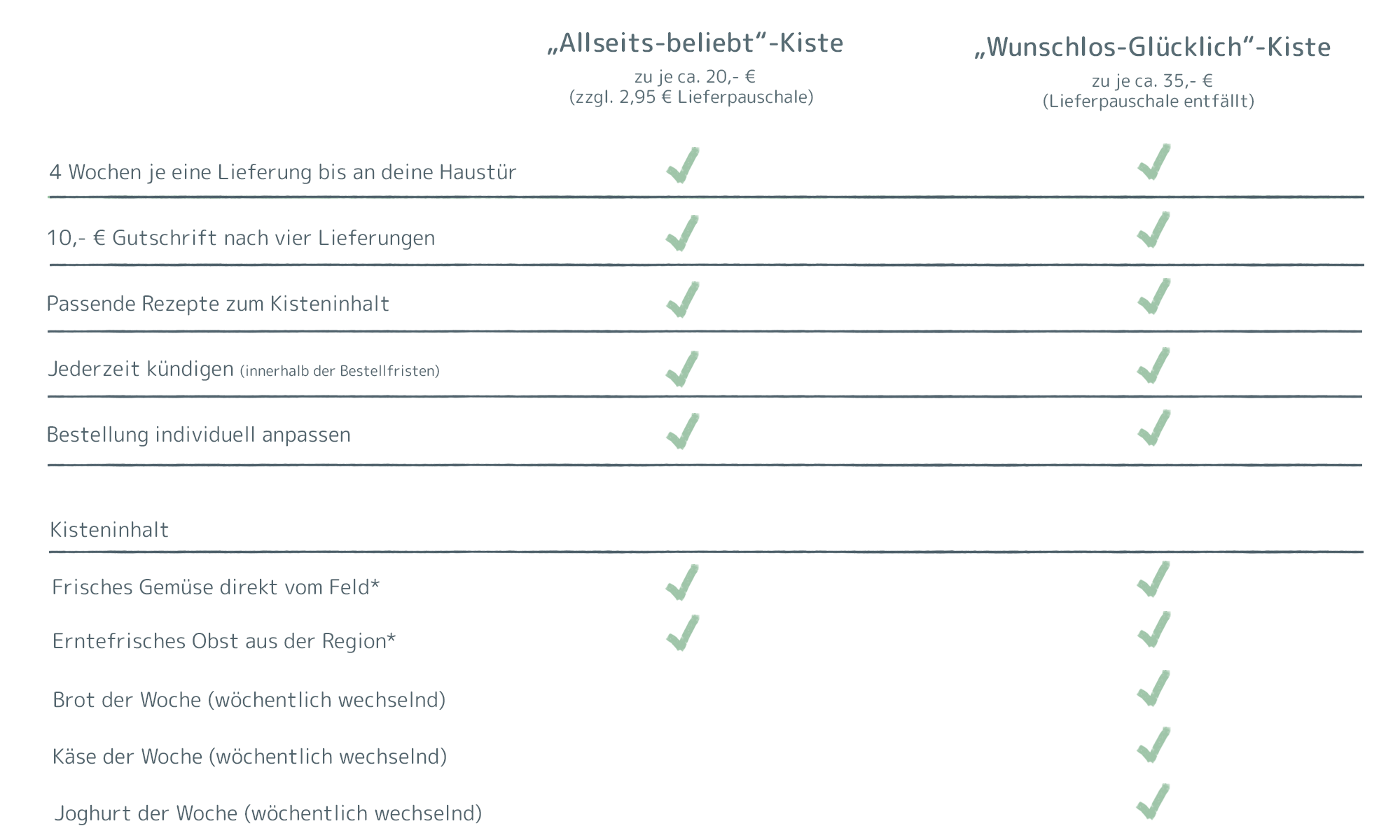 Das Bild zeigt zwei Angebote von Biokisten mit frischem Obst und Gemüse sowie zusätzlichen biologischen Produkten. Die "Wunschlos-Glücklich-Kiste" kostet ca. 35 Euro, während die "Allseits-Beliebt-Kiste" ab ca. 20 Euro erhältlich ist.