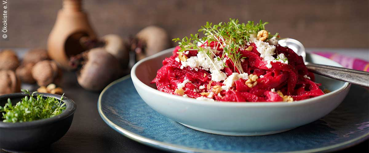 • Die Nudeln mit der Rote Bete-Sauce vermengen, mit dem restlichen zerbröselten Feta, den Walnüssen und der Kresse bestreuen.