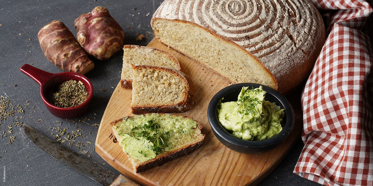 2. Topinambur abgießen, unter kaltem Wasser ab- schrecken und schälen. Buttermilch, Hefe und Topi- nambur zusammen pürieren und zum Mehl geben. Mit den Knethaken des Handrührers zu einem glat- ten Teig verkneten. Sollte der Teig sehr kleben, kann weiteres Mehl untergeknetet werden. An einem warmen Ort den Teig abgedeckt 2 Stunden gehen lassen.