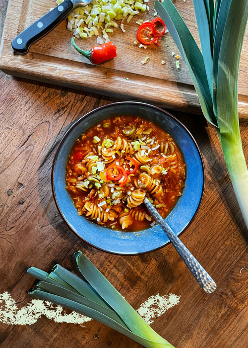 Ich liebe Eintöpfe und sie gehören fest in mein Essensrepertoire. Eines der ersten Rezepte die ich in der siebten oder achten Klasse in der Schule im Hauswirtschaftsunterricht gelernt habe, begleitet mich und meine Familie bis heute und es wird sich regelmäßig gewünscht. Dabei ist es so simpel und besteht im Grundrezept aus eigentlich nur vier Grundzutaten: Spirelli-Nudeln, Porree, Tomatenmark und Hackfleisch. So ist die Variante auf jeden Fall auch kindertauglich. Bei mir gibt es mittlerweile aber auch oft die gepimpte Version mit etwas mehr Schärfe und da ich schon lange vegetarisch lebe, ersetze ich das Hackleisch durch eine pflanzliche Variante.