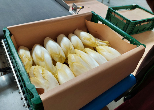 Bevor der Chicorée auch trotz Dunkelheit die Blüte bilden würde, wird der Chicorée geerntet. Dabei ist dieser circa 15 Minuten am Licht und wird dann schnell wieder in Papier eingewickelt und in Kisten verpackt, damit er möglichst lange schmackhaft bleibt und nicht bitter wird.