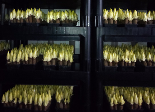 Grundsätzlich wird Chicorée bei uns in einer großen dunklen Halle produziert.