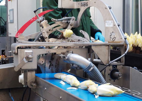 Also so ein typischer Montag sieht bei uns so aus, dass wir mit der Produktion gegen 8:00 Uhr in der Halle beginnen. Zwei unserer Mitarbeiter pflanzen den aufgetauten Chicorée und schaffen es, am Tag 3 Holzkisten zu bepflanzen. Gleichzeitig fange ich mit vier Mitarbeitern an den Chicorée zu ernten. Die Ernte ist aufwendiger, weshalb auch mehr Mitarbeiter für diesen Arbeitsschritt benötigt werden. Zuerst wird der Kopf von der Wurzel mithilfe einer Maschine getrennt, dann wird der Kopf kontrolliert. Nachdem die einwandfreie Qualität festgestellt wurde, wird dieser verpackt und auf Paletten für den Weitertransport vorbereitet.