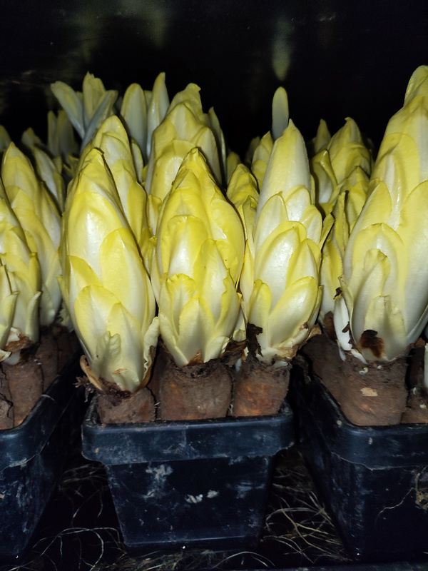 Chicoree braucht Dunkelheit um schmackhaft zu wachsen. So bildet er nicht so viel Bitterstoffe aus und bleibt zart. Dadurch bleiben auch die Blätter sehr hell.  Chicoree wird auch am liebsten so gelagert, im Kühlschrank in Papier bleibt er bis zu einer Woche frisch und knackig.