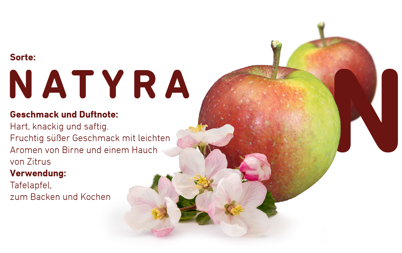Zusätzlich findet sich im Angebot im Sommer die hoch aromatische Sorte Natyra. Diese Sorte bringt mittelgroße, rote Früchte mit festem, knackigen, saftig, süßem Fruchtfleisch hervor. Sie eignet sich perfekt als Tafelapfel.