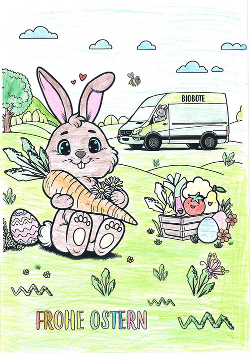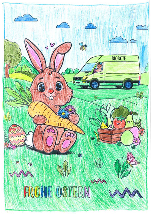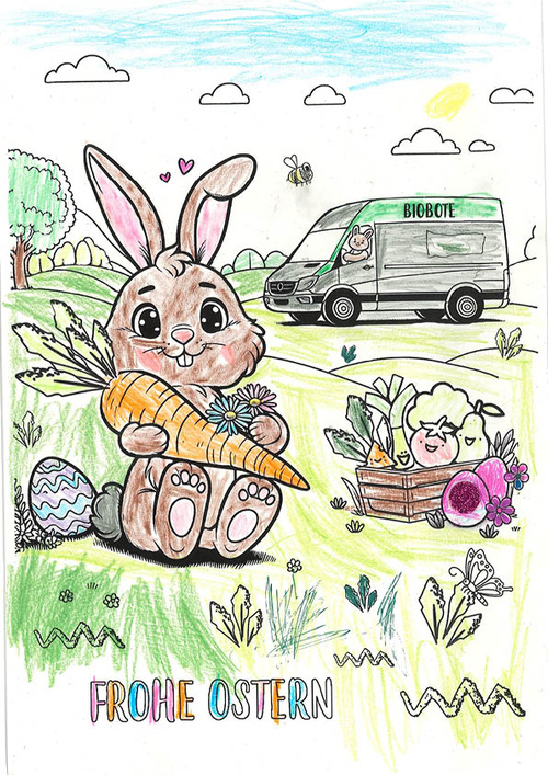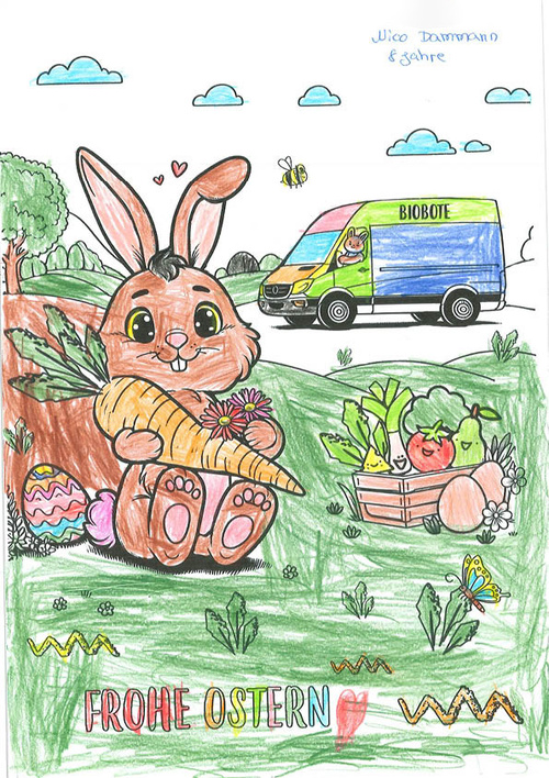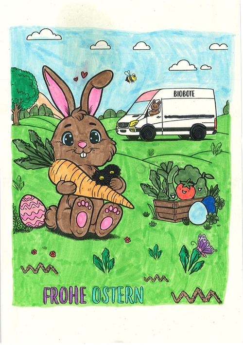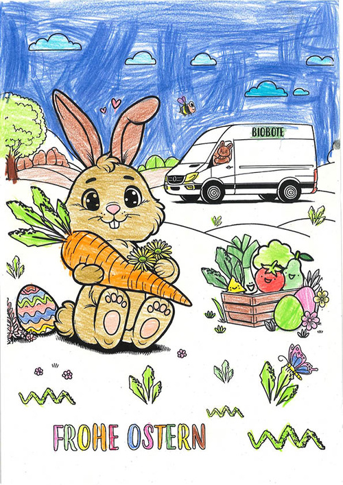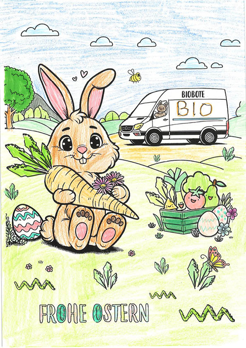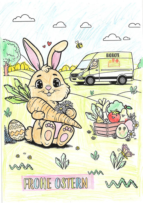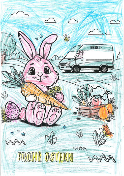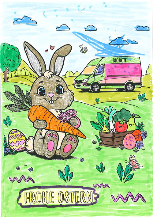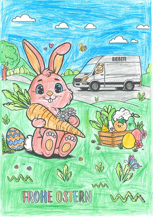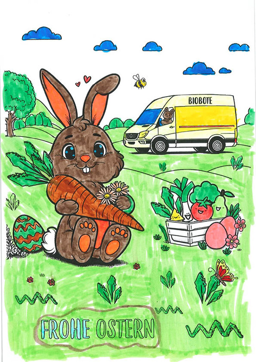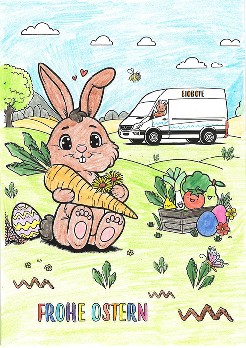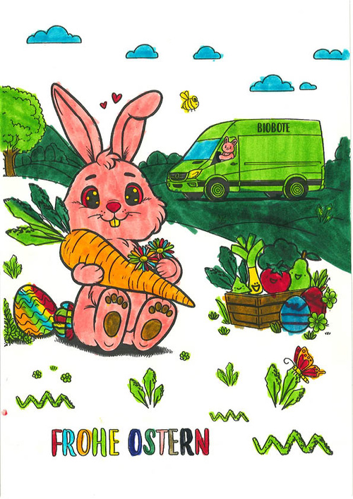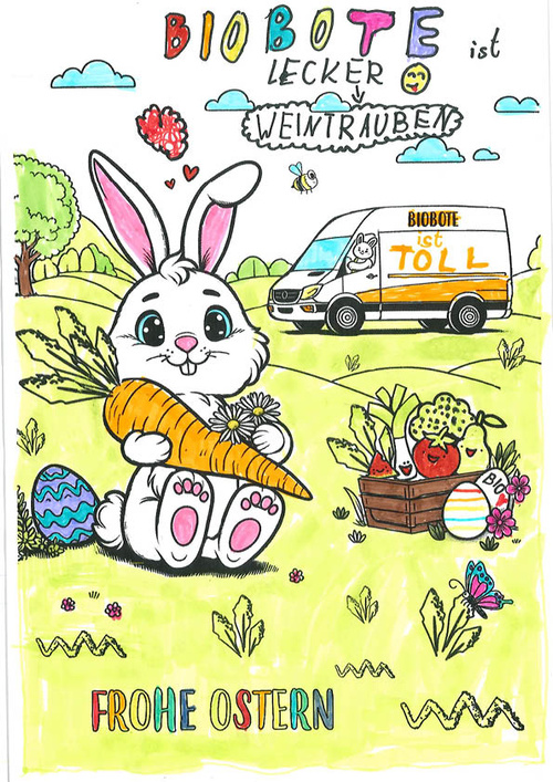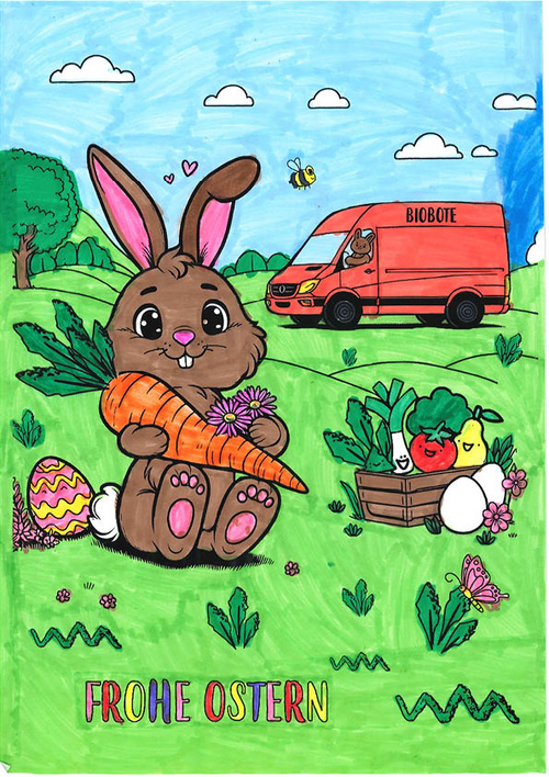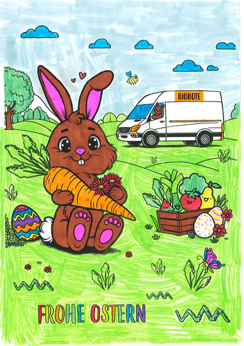 KI generiert: Ein fröhlicher Osterhase hält eine Karotte; im Hintergrund ein Biobote-Lieferwagen. Text: "FROHE OSTERN".