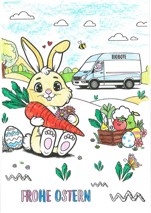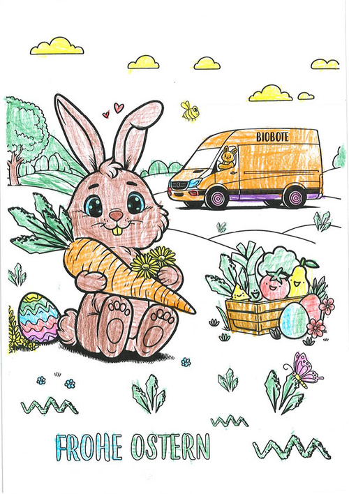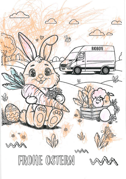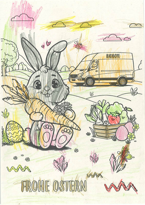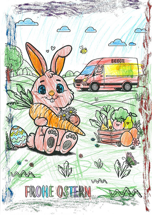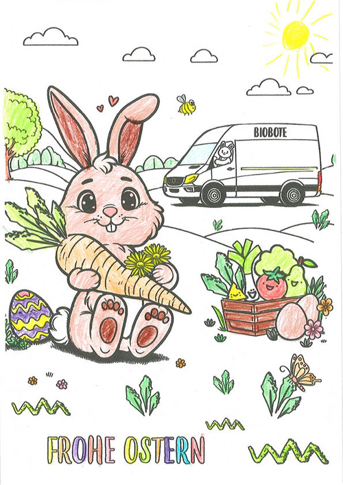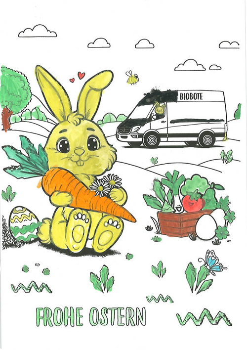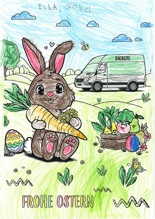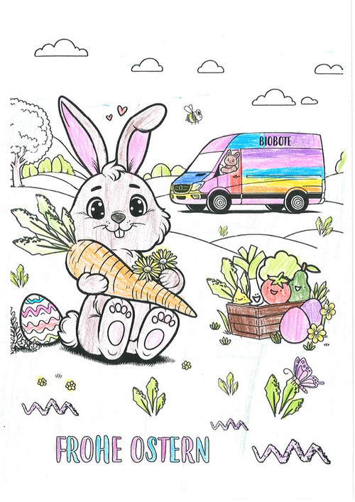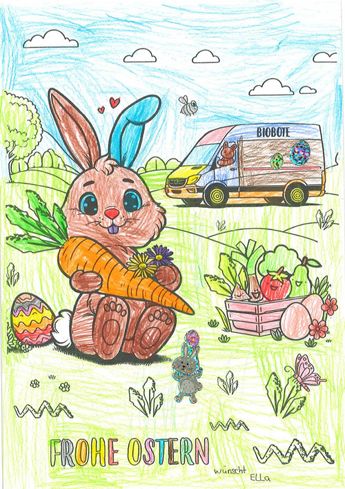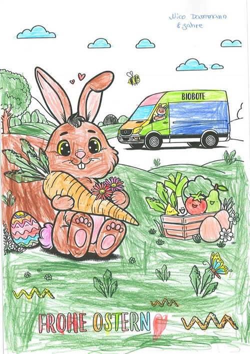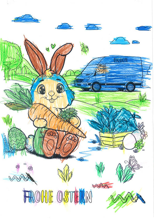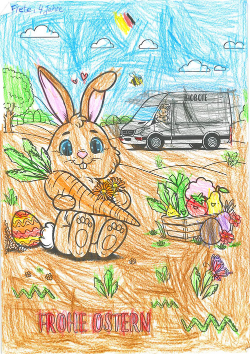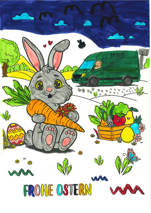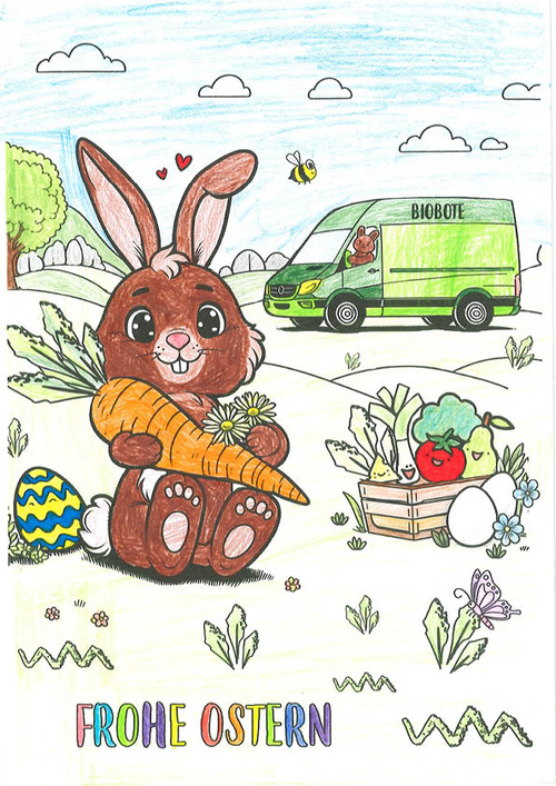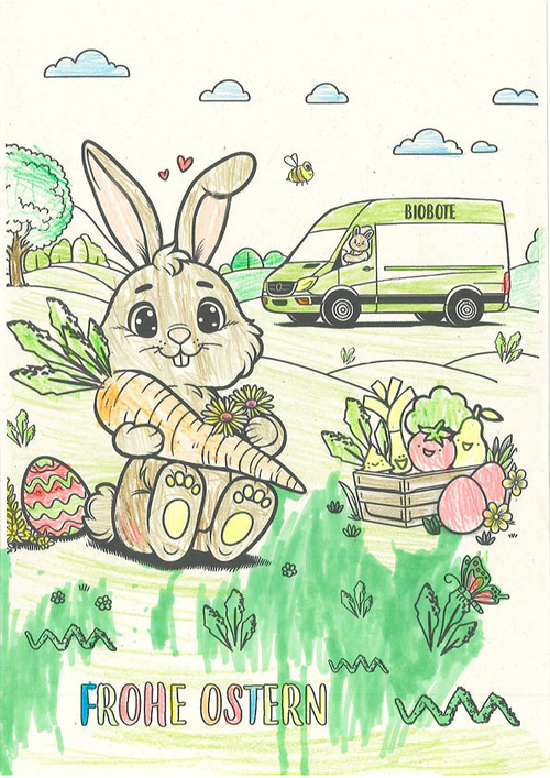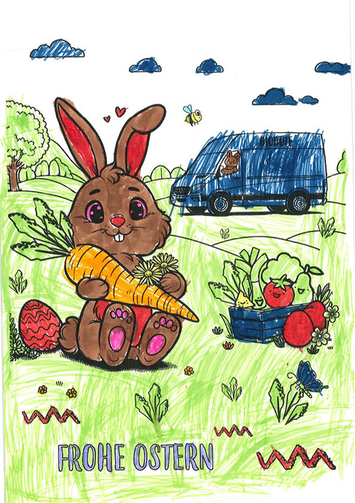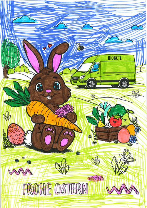 KI generiert: Ein fröhlicher Osterhase hält eine Karotte; im Hintergrund ein Biobote-Lieferwagen. Text: "FROHE OSTERN".