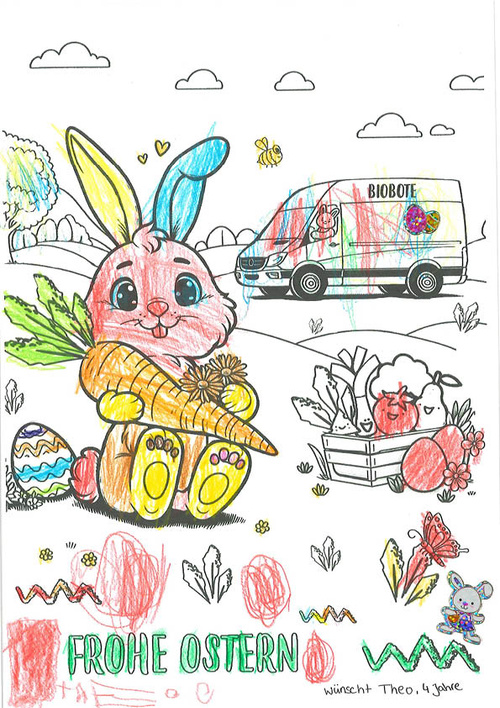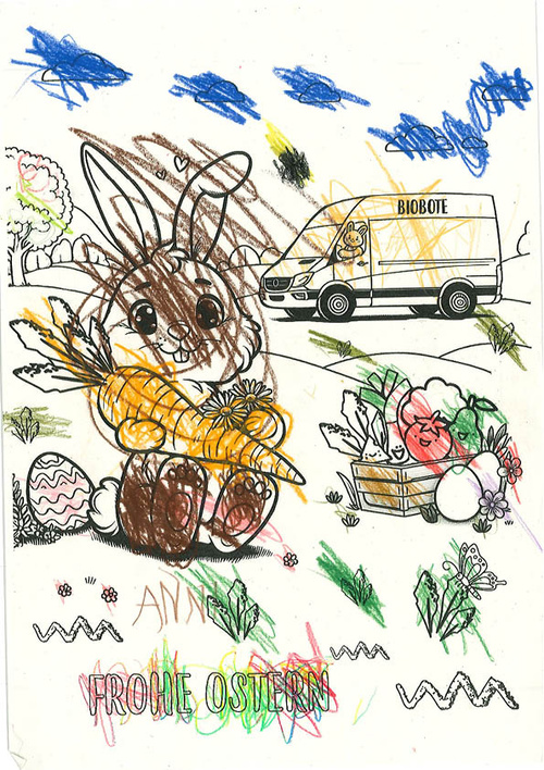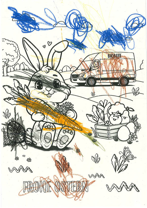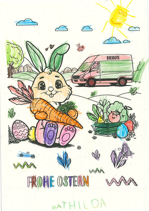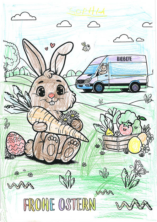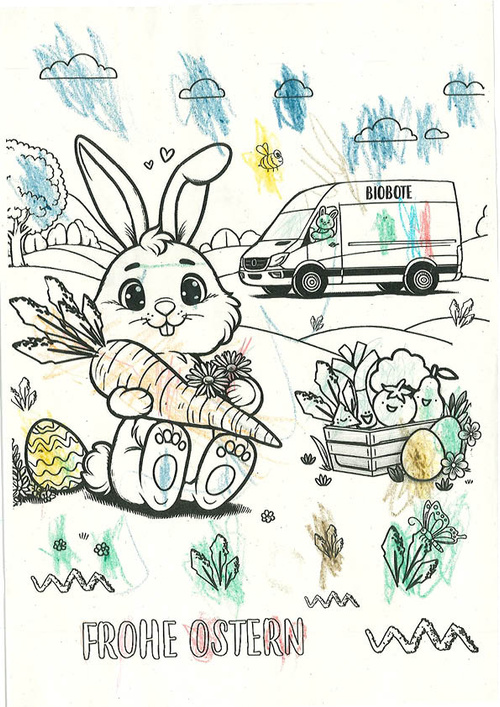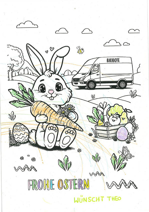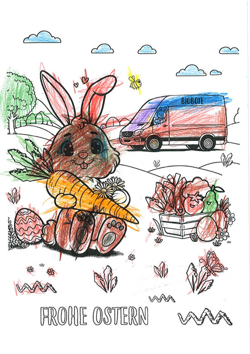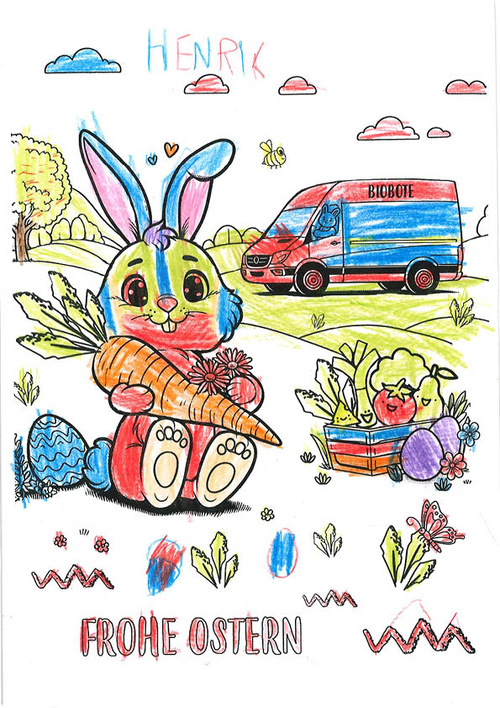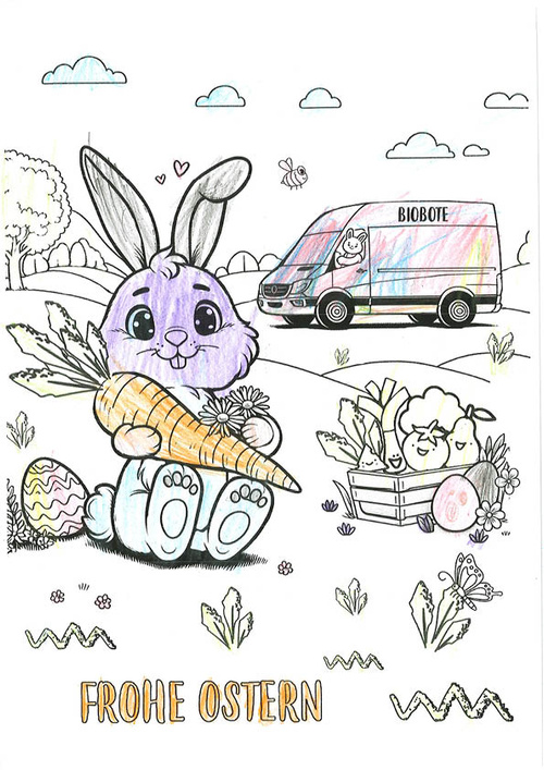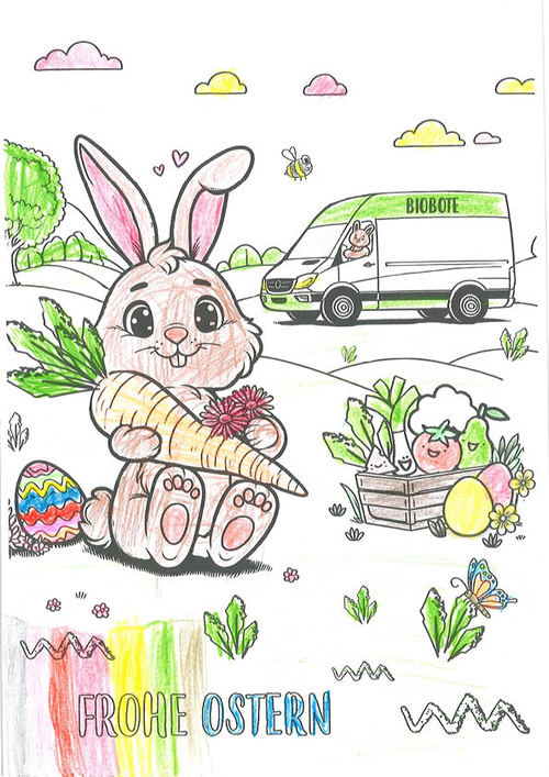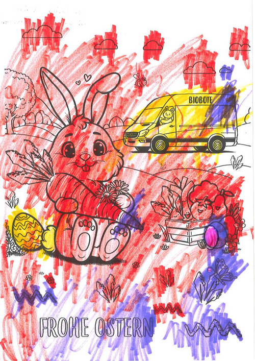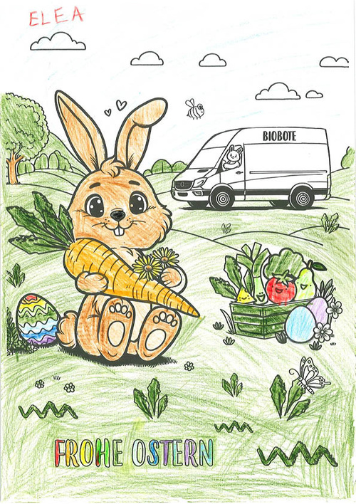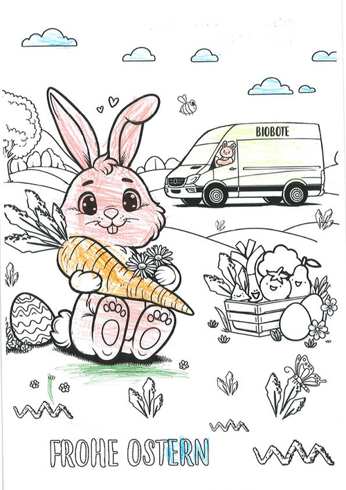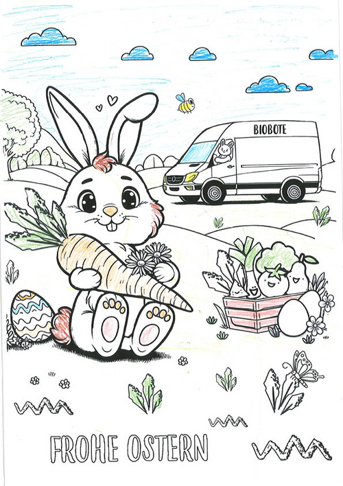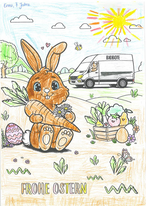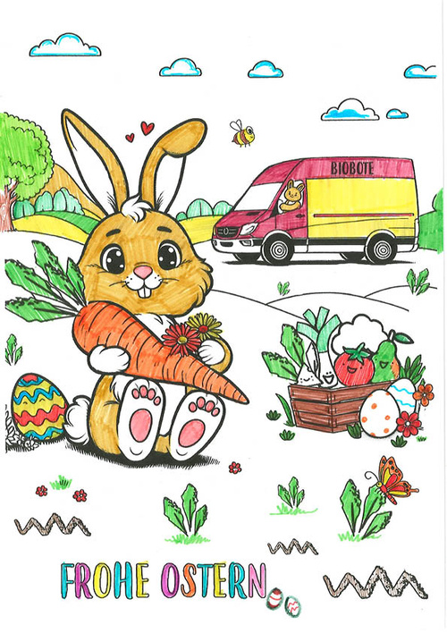KI generiert: Ein fröhlicher Osterhase hält eine Karotte; im Hintergrund ein Biobote-Lieferwagen. Text: "FROHE OSTERN".