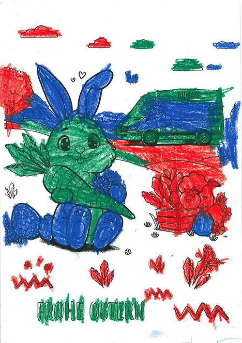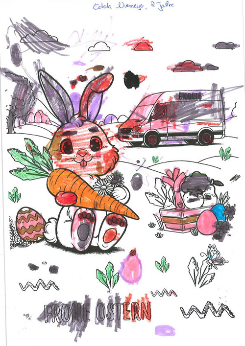 KI generiert: Ein Hase hält eine Karotte, daneben ein buntes Ei. Text: "FROHE OSTERN". Im Hintergrund ein Lieferwagen.