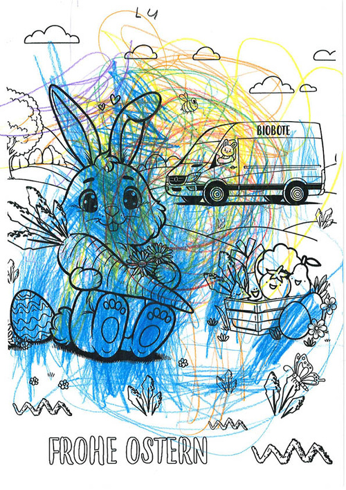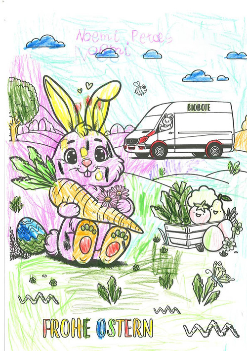 KI generiert: Ein bunter Osterhase mit Karotte, daneben ein Biobot-Lieferwagen. Text: "NORA GEBBEKEN [...] FROHE OSTERN".