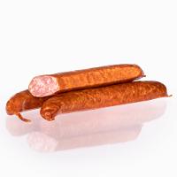 Schweinefleisch (110 g/100 g)*, Meersalz, Gewürze (Zwiebel, Liebstöckel, Brennnesselblätter, Majoran, Pfeffer, Macisblüte, Muskatnuss)*, Vollrohrzucker*, Rote-Bete-Saft* (färbendes Lebensmittel), Rauch, Schweinedarm