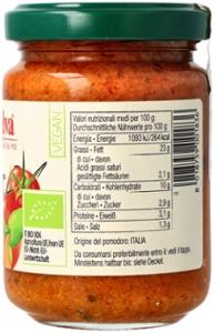 Tomaten* 49%, Sonnenblumenöl*, getrocknete Tomaten* 11,8%, CASHEWKERNE* 5,3%, Basilikum* 4,7%, Kartoffelflocken*, natives Olivenöl extra*, Pinienkerne*, Knoblauch*, Meersalz.