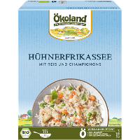 41% Reis* gegart (Wasser, Reis*, Speisesalz), 15 % Gemüse* - in veränderlichen Gewichtsanteilen (Karotten*, Erbsen*), 15% Hühnerfleisch* gegart, 14% Champignons*, SAHNE*, Maisstärke*, Meersalz, Reismehl*, Zitronensaft*, Gewürze* (Muskatnuss*, Pfeffer*, Kurkuma*, Knoblauch*), Roh-Rohrzucker*, Hühnerfett*.| Energie | Fett | gesättigte Fettsäuren | Kohlenhydrate | Zucker | Ballaststoffe | Eiweiss | Salz |