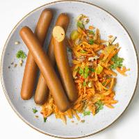 Trinkwasser, Sonnenblumenöl*, Zwiebeln*, 8,7% WEIZENEIWEISS*, 5,5% EIEIWEIß* getrocknet, Meersalz, Tomatenmark*, Paprika*, Verdickungsmittel: Guarkernmehl*; Porree*, WEIZENVOLLKORN* geschrotet, Steinsalz, Maltodextrin*, Karotten*, Maisstärke*, Ingwer*, Knoblauch*, Koriander*, Kümmel*, Muskatnuss*, Chili*, Curcuma*, Pfeffer*, Liebstöckel*, Petersilie*, Buchenholzrauch.| Energie | Fett | gesättigte Fettsäuren | Kohlenhydrate | Zucker | Ballaststoffe | Eiweiss | Salz |