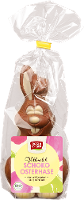 Lachender Osterhase aus Vollmilchschokolade - liebevoll von Hand mit weißer Schokolade geschminkt.