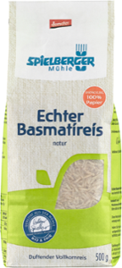 Der Basmati-Naturreis in bester demeter-Qualität wird nur vom unverdaulichen Spelz befreit. Dabei bleibt das wertvolle Silberhäutchen erhalten. Dieses umgibt das Reiskorn. Direkt darunter befinden sich die meisten Vitamine und Mineralstoffe. Wird das Reiskorn geschält, geht einiges davon verloren. Bei Naturreis ist das Silberhäutchen jedoch noch erhalten und somit auch wertvolle Vitamine und Mineralstoffe. Der Basmatireis duftet und ist besonders aromatisch im Geschmack. Er eignet sich als Beilage oder Basis für verschiedenste Gerichte, besonders für die indische, nahöstliche oder persische Küche.Der Basmatireis kommt aus einem Demeter-Anbauprojekt aus den Regionen Bahraich und Uttarakhand am Fuße des Himalayas in Indien. Dieses Reisprojekt gibt indischen Landwirt:innen eine neue Perspektive.    Sowohl der Anbau, als auch die Verpackung steht für Nachhaltigkeit. Sie basiert zu 100% auf dem nachwachsenden Rohstoff Holz. Sie können vollständig im Altpapier gesammelt und zu 100% recycelt werden. Durch eine dauerhafte Partnerschaft mit dem Bergwaldprojekt e.V. finanziert die Spielberger Mühle jedes Jahr das Pflanzen von Bäumen sowie die Pflege und den Erhalt des bestehenden Waldes. Letzteres ermöglicht dem Wald, sich auf natürliche Art zu verjüngen - das heißt neue Bäume wachsen und der Wald gedeiht. Damit wird der Papierkreislauf geschlossen, indem der Papierverbrauch für die Verpackungen ausgeglichen und der Natur etwas zurückgegeben wird.