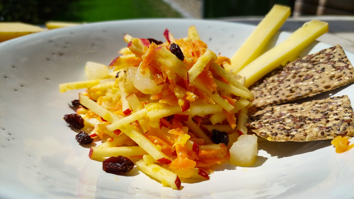 3. Möhren putzen, schälen und grob raspeln. Äpfel waschen, entkernen und in Streifen schneiden.