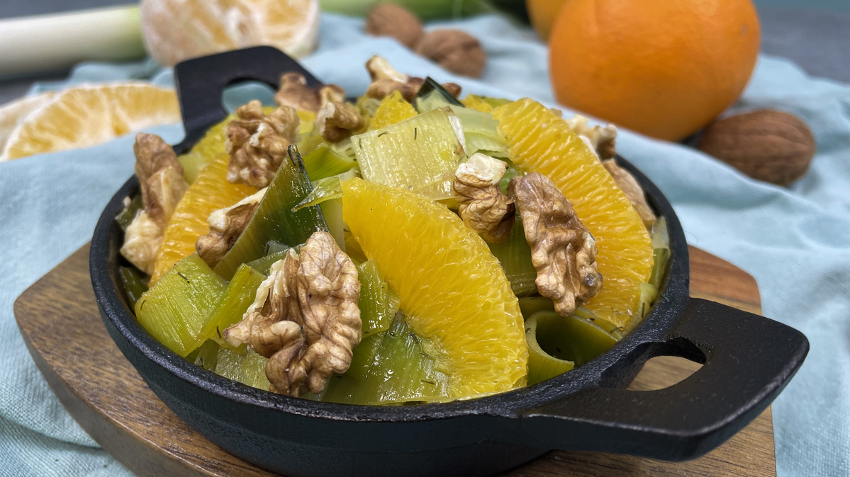 4. Olivenöl in einer Pfanne erwärmen, den Porree hinzugeben und bei mittlerer Hitze ca. 5 Minuten langsam schmoren. Salzen und den Orangensaft hinzugeben und etwas einkochen lassen.