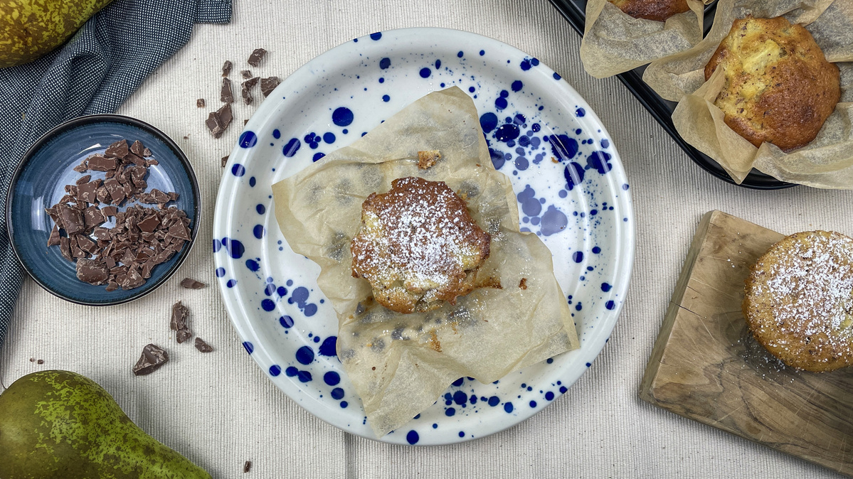 4. Schokolade klein hacken oder raspeln und zusammen mit den Birnen unter die Masse heben.