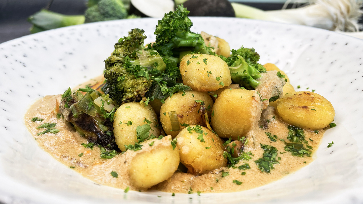 Gemüse und Gnocchi auf Teller anrichten, mit Petersilie bestreuen und servieren.