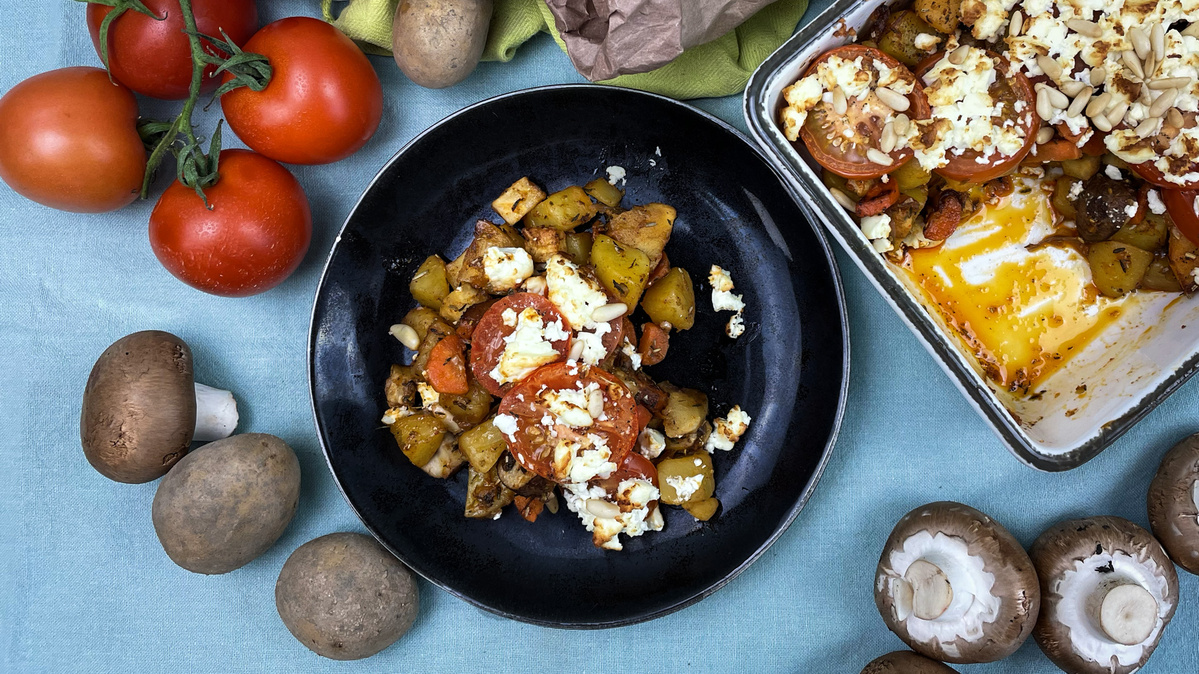 3. Tomaten waschen, den Strunk entfernen und in Scheiben schneiden. Pastinaken, Möhren, Sellerie, Champignons jeweils separat mit 1 EL erhitzen Öl in einer Pfanne von allen Seiten anbraten, würzen mit Salz & Pfeffer und zu den Kartoffeln geben.