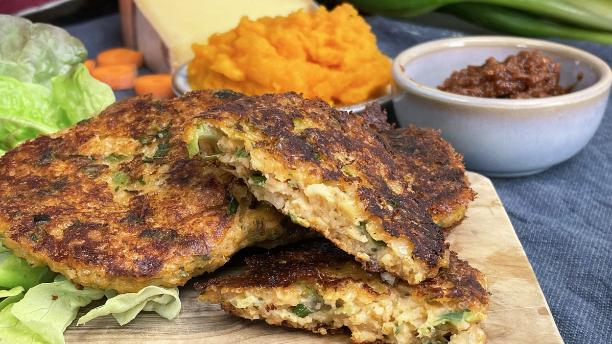 4 Personen gut passt – also je 3 Taler mit einer großzügigen Portion Möhrenstampf und Pesto.