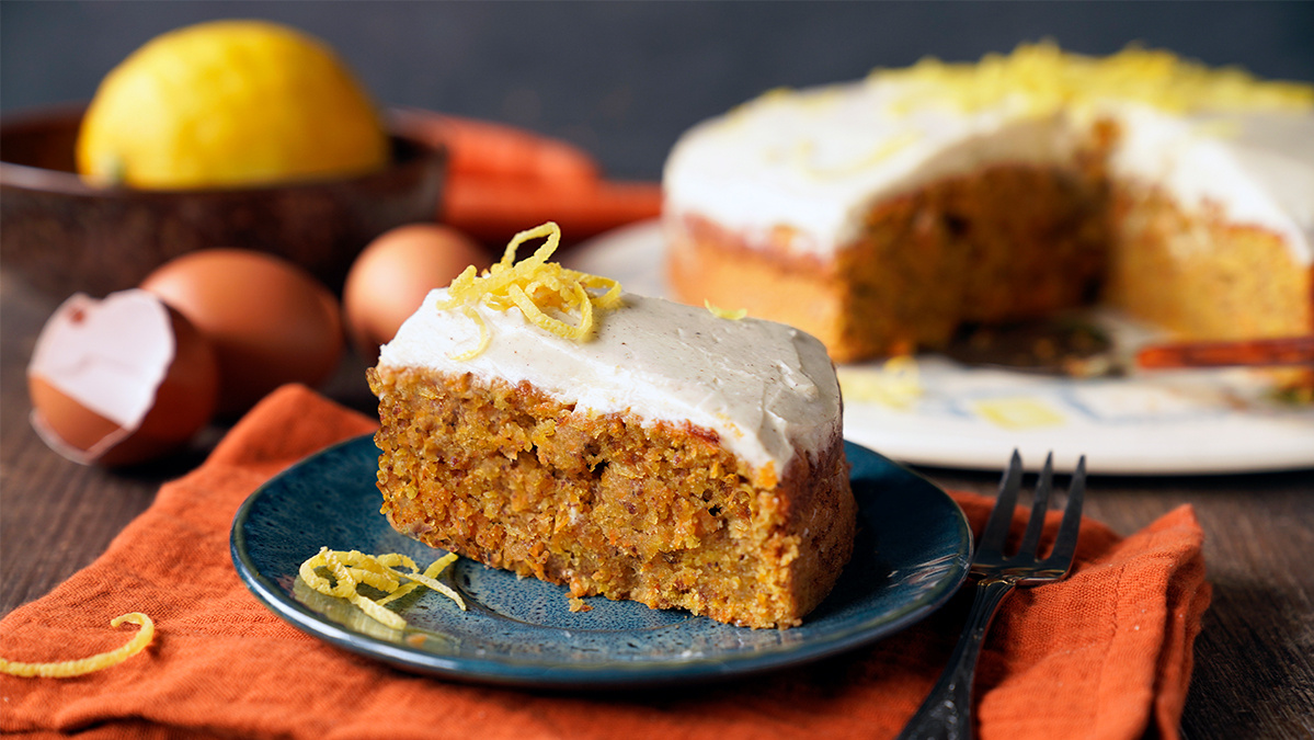 TIPP: Man kann auch gehackte Haselnüsse, Pistazien oder kleine Marzipan-Möhren auf dem Kuchen verteilen.