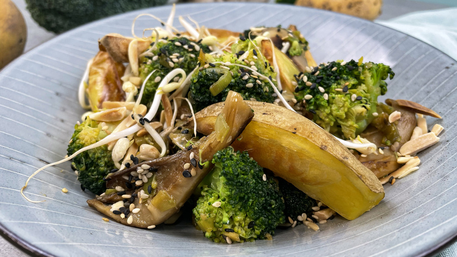 Knusprige Kartoffelspalten aus dem Ofen mit asiatischem Gemüse – würzig, knackig und ein schöner Mix aus Ofen und Pfanne.