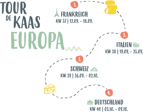 In unserer ersten Tour de Kaas möchten wir mit euch quer durch Europa reisen. Jede Woche widmet unser Käseexperte Andreas einem anderen europäischen Land und stellt dessen beste Käsesorten in den Mittelpunkt. Begleitet ihn durch Frankreich, Italien, die Schweiz und Deutschland! Vom 12.09. bis zum 09.10. probieren wir uns so gemeinsam durch 20 Bio-Käsesorten, von der Nordeeküste bis zum Mittelmeer.